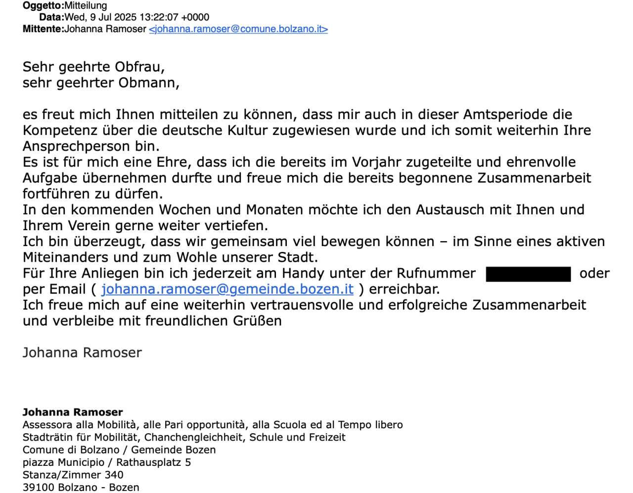 “Gentile Obfrau, gentile Obmann, sono lieto di informarLa che anche in questo mandato mi è stata assegnata la competenza sulla cultura tedesca e che quindi continuerò a essere la Sua referente. È un onore per me poter assumere quest’importante compito già assegnatomi lo scorso anno e sono ansiosa di proseguire la collaborazione già avviata”. Firmato: assessora comunale Johanna Ramoser (SVP). La mail è stata inviata qualche giorno fa dall’assessora ad alcune organizzazioni culturali del capoluogo. “Nelle prossime settimane e nei prossimi mesi, vorrei approfondire il dialogo con voi e con la vostra associazione”, prosegue il messaggio, “sono convinta che insieme possiamo fare molto, in uno spirito di cooperazione attiva e per il bene della nostra città”.
