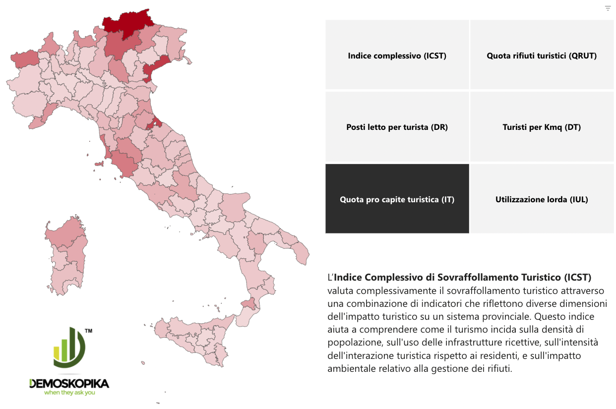 Per il secondo anno consecutivo, l'Alto Adige è con Rimini e Venezia sul podio delle destinazioni più esposte all’overtourism indicate dalla mappa interattiva dell’Indice Complessivo di Sovraffollamento Turistico (ICST) ideato ed elaborato dall’Istituto Demoskopika. Ai sette sistemi turistici provinciali già in vetta nel 2024, Rimini, Venezia, Bolzano, Livorno, Napoli, Trento e Verona, si affiancano quest’anno anche Milano, Roma e Trieste. Sale così a dieci il numero delle destinazioni con un livello di sovraffollamento turistico classificato come “Molto Alto”, che “soffrono” maggiormente il turismo internazionale "con effetti crescenti sulla vivibilità dei territori, sulla resilienza dei sistemi locali e sulla sostenibilità complessiva delle province coinvolte". Sul versante dell’intensità turistica, ovvero il rapporto tra presenze e popolazione residente, si conferma al primo posto la provincia di Bolzano, con quasi 69 turisti per abitante, seguita da Venezia con quasi 47 turisti per abitante.