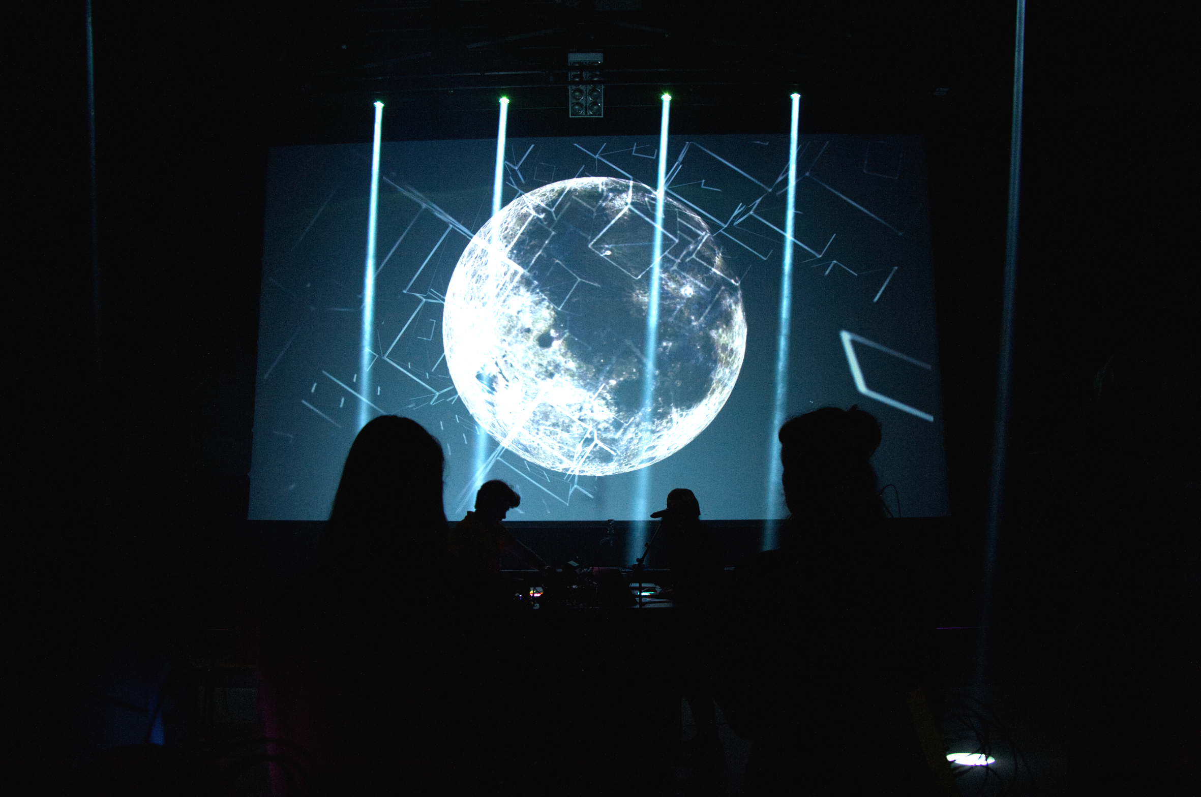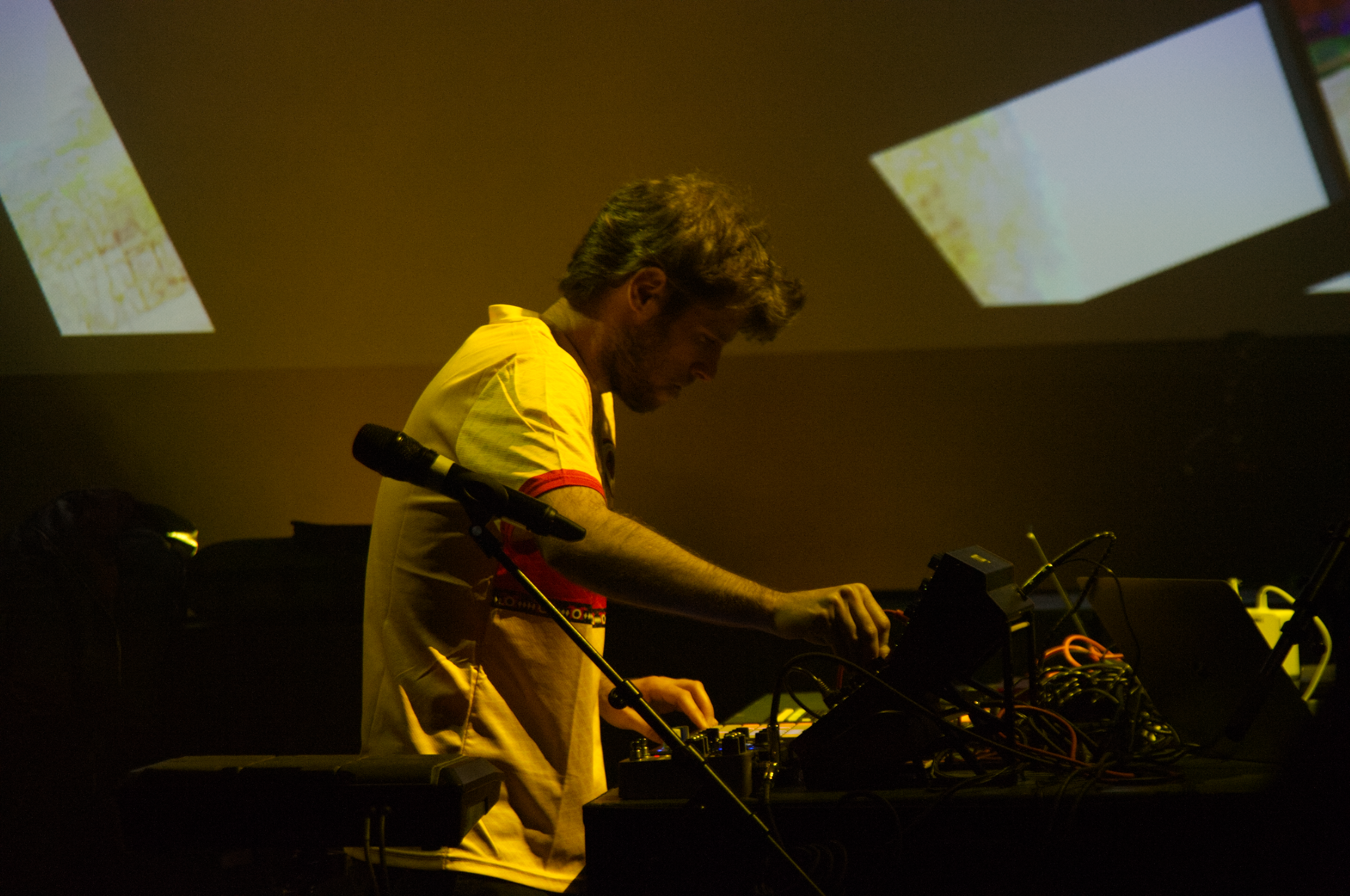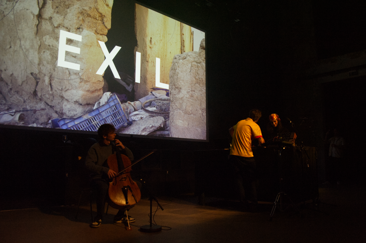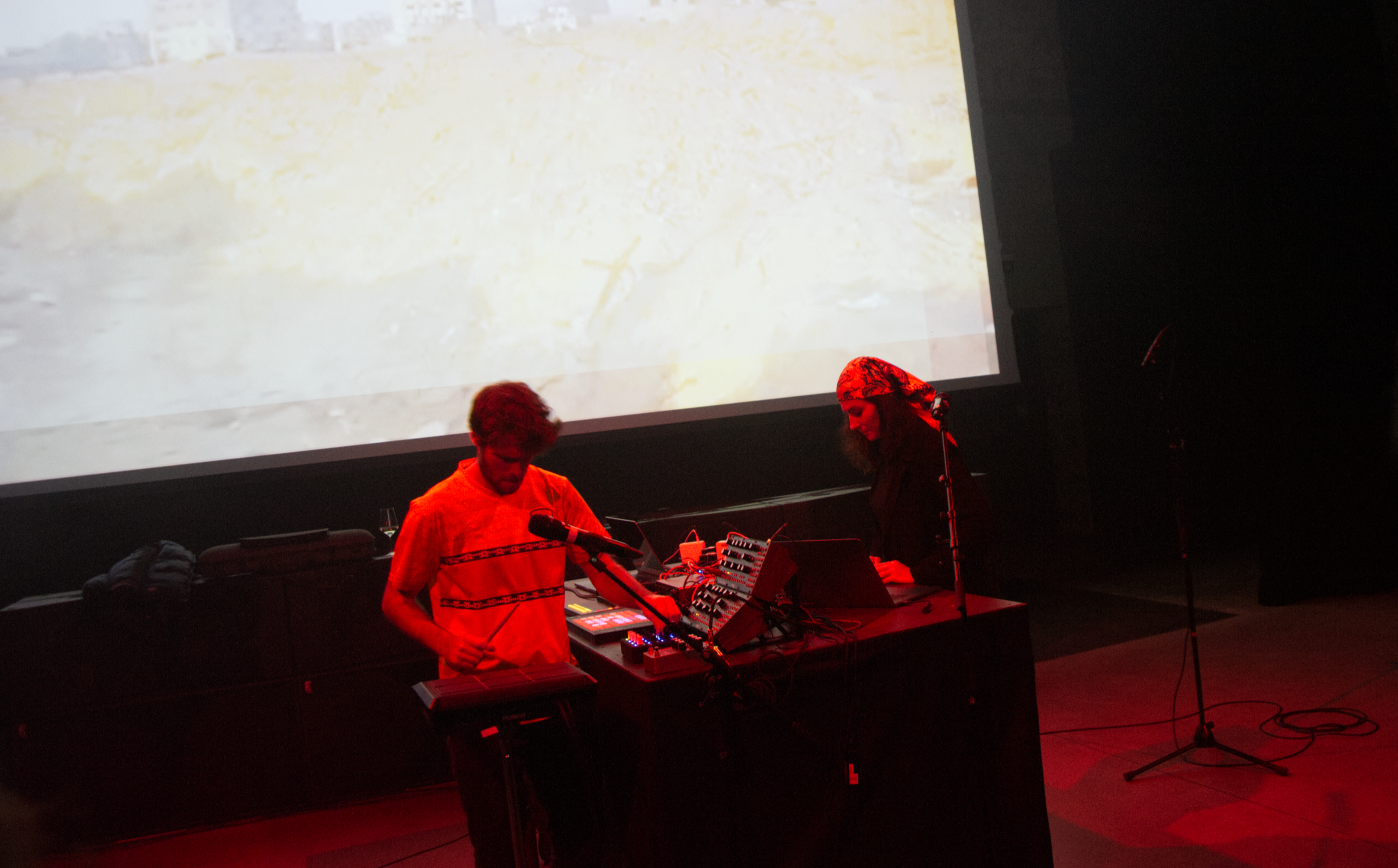 Die Visuals waren sehr stark, ob es sich dabei nun um Handy-Aufnahmen aus den besagten Krisengebieten handelte, ob es abstrakte Flächen waren oder ob es sich um in die deutsche Sprache übersetzte Auszüge aus den Träumen von Guefif oder die Übersetzung verschiedener Sprachsamples handelte, sie gaben der bisweilen treibenden und dramatischen Musik Tiefe, machten diese zum perfekten Soundtrack der Erzählung der Stücke.