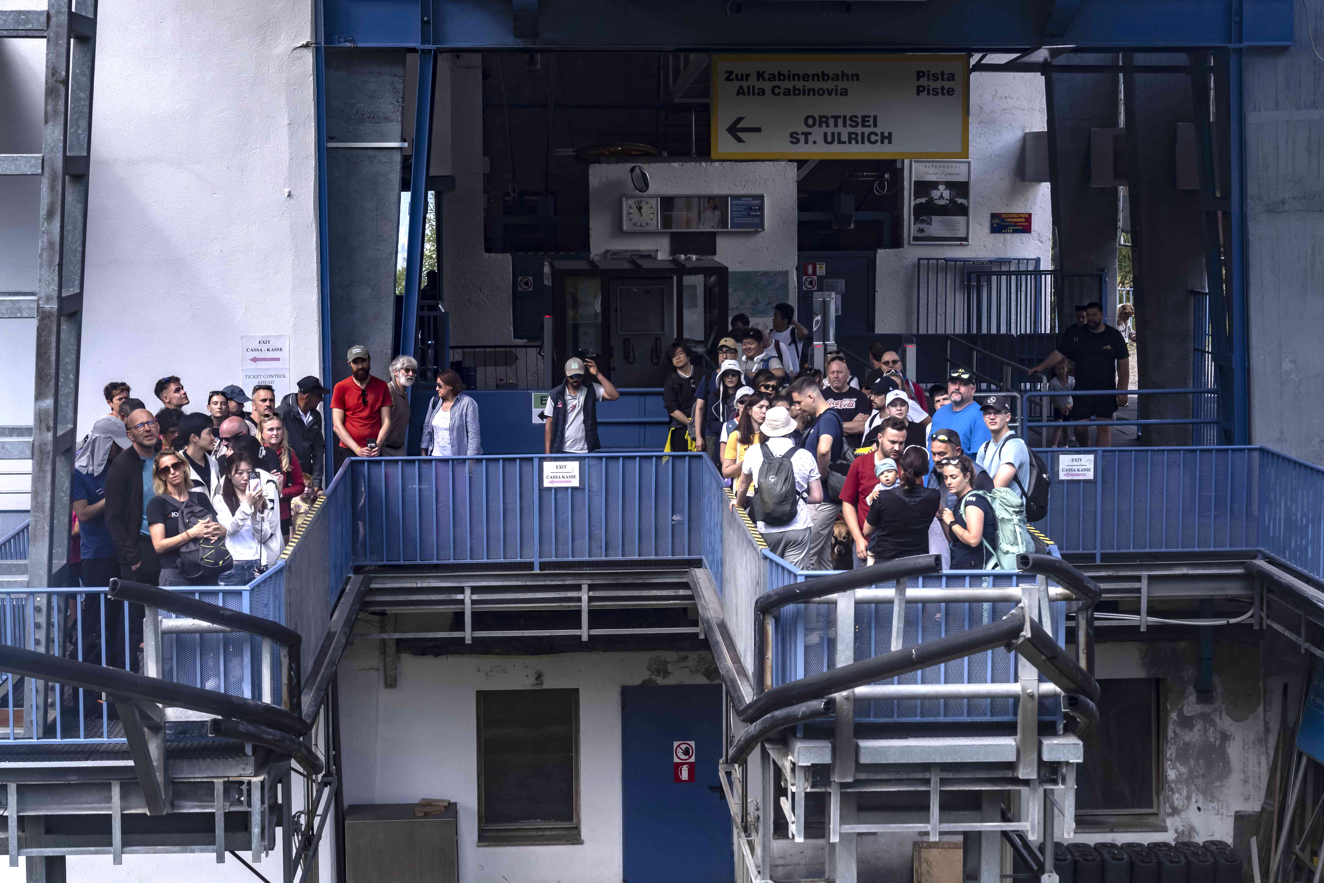 La fila alla stazione intermedia si forma per via della differenza di portata tra i due impianti che portano sul Seceda.