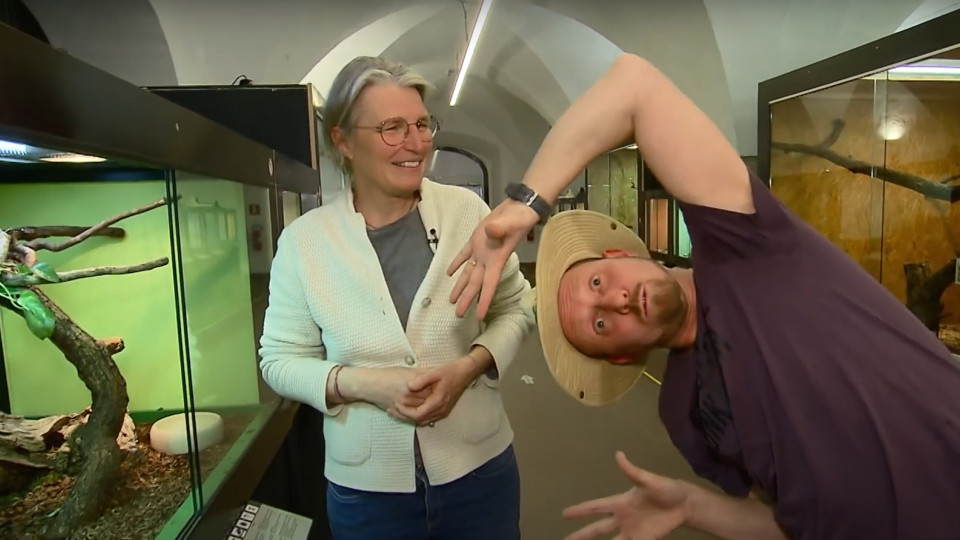 "Pfote"-Moderator Stefan ist angetan von den 40 Echsen, die man dort zurzeit bewundern kann. Und er will auch ihre Vorfahren, die Dinosaurier, genauer erforschen. Im ersten Stock des Museums findet er das Fossil des ältesten Kriechtieres der Welt.
