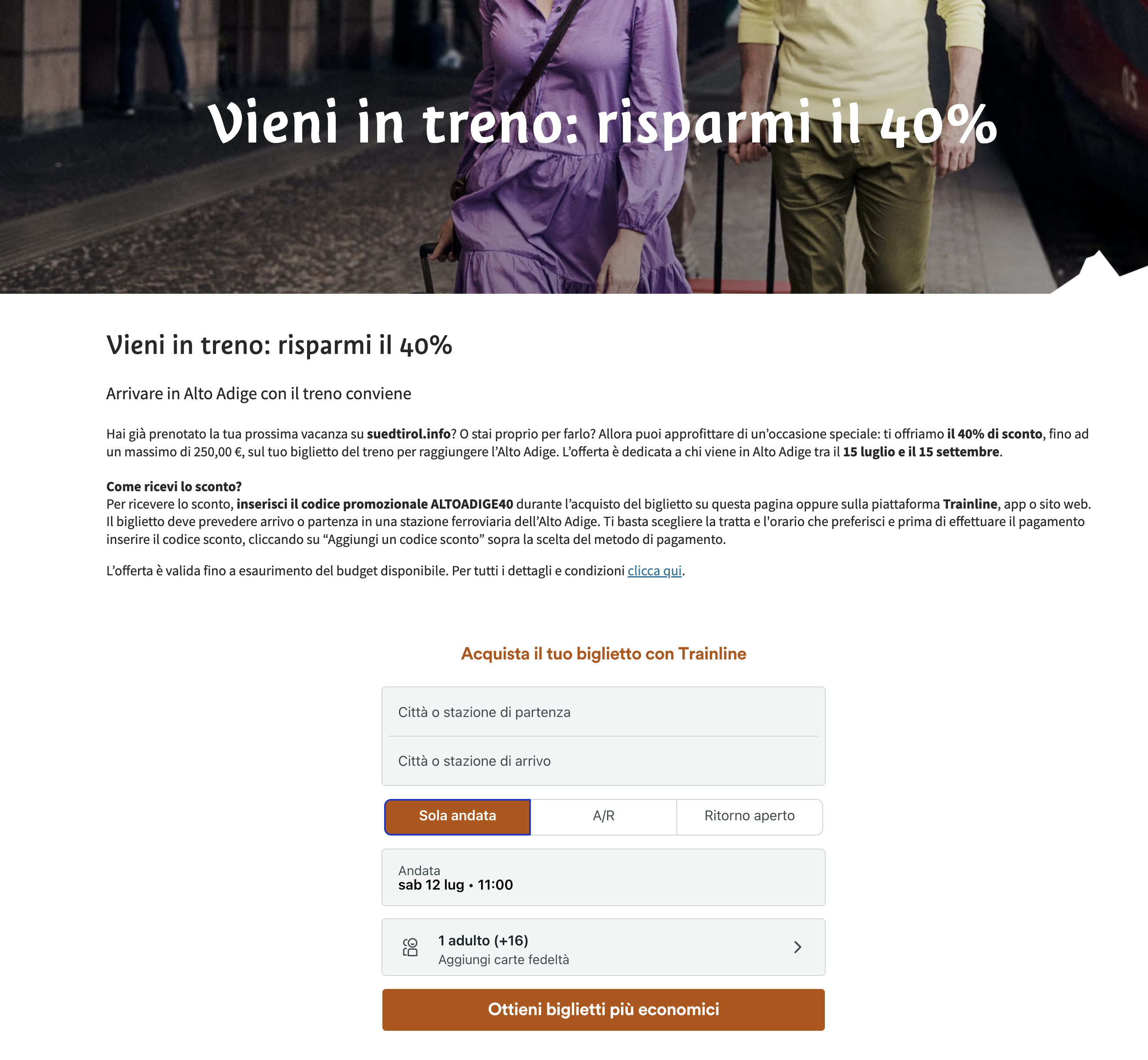 Mit einem 40-Prozent-Rabatt auf Zugtickets wollte die IDM mehr Urlauber zur Anreise mit der Bahn bewegen und damit das Straßennetz in der Hochsaison zumindest kurzfristig entlasten. Ein Ansatz, der angesichts von Dauerstaus und Massentourismus durchaus Potenzial gehabt hätte. Wer eine Unterkunft buchte, sollte per E-Mail einen Rabattcode („ALTOADIGE40“) erhalten, um über „thetrainline.com“ ermäßigte Zugtickets für den Zeitraum zwischen 15. Juli und 15. September zu buchen. Doch schon kurz nach dem holprigen Start wurde die Aktion von IDM und Landesregierung eingestellt. Ein anonymer Marketingfachmann erklärt: Solche Maßnahmen erfordern Zeit und ein durchdachtes Budget – beides wurde diesem Pilotprojekt offenbar nicht eingeräumt.