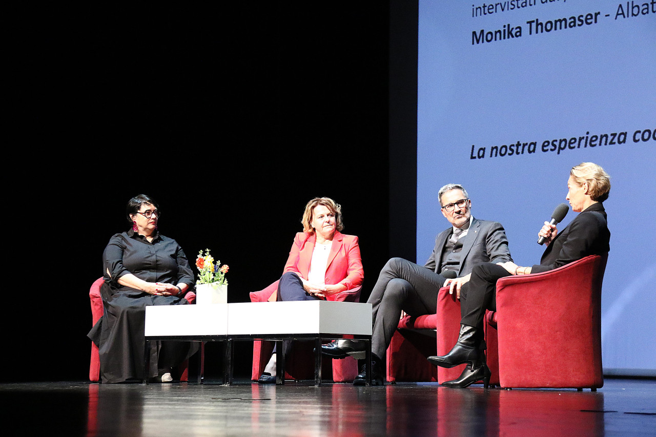 Weiter ging es mit der Podiumsdiskussion „Der Schlüssel zur sozialen Inklusion – in ascolto“, in der Landeshauptmann Arno Kompatscher und Genossenschafts-Landesrätin Rosmarie Pamer von zwei Mitgliedern des Vorstands von Coopbund Alto Adige Südtirol, Monika Thomaser (Genossenschaft Albatros) und Francesca Peruz (Genossenschaft Clab) interviewt wurden.