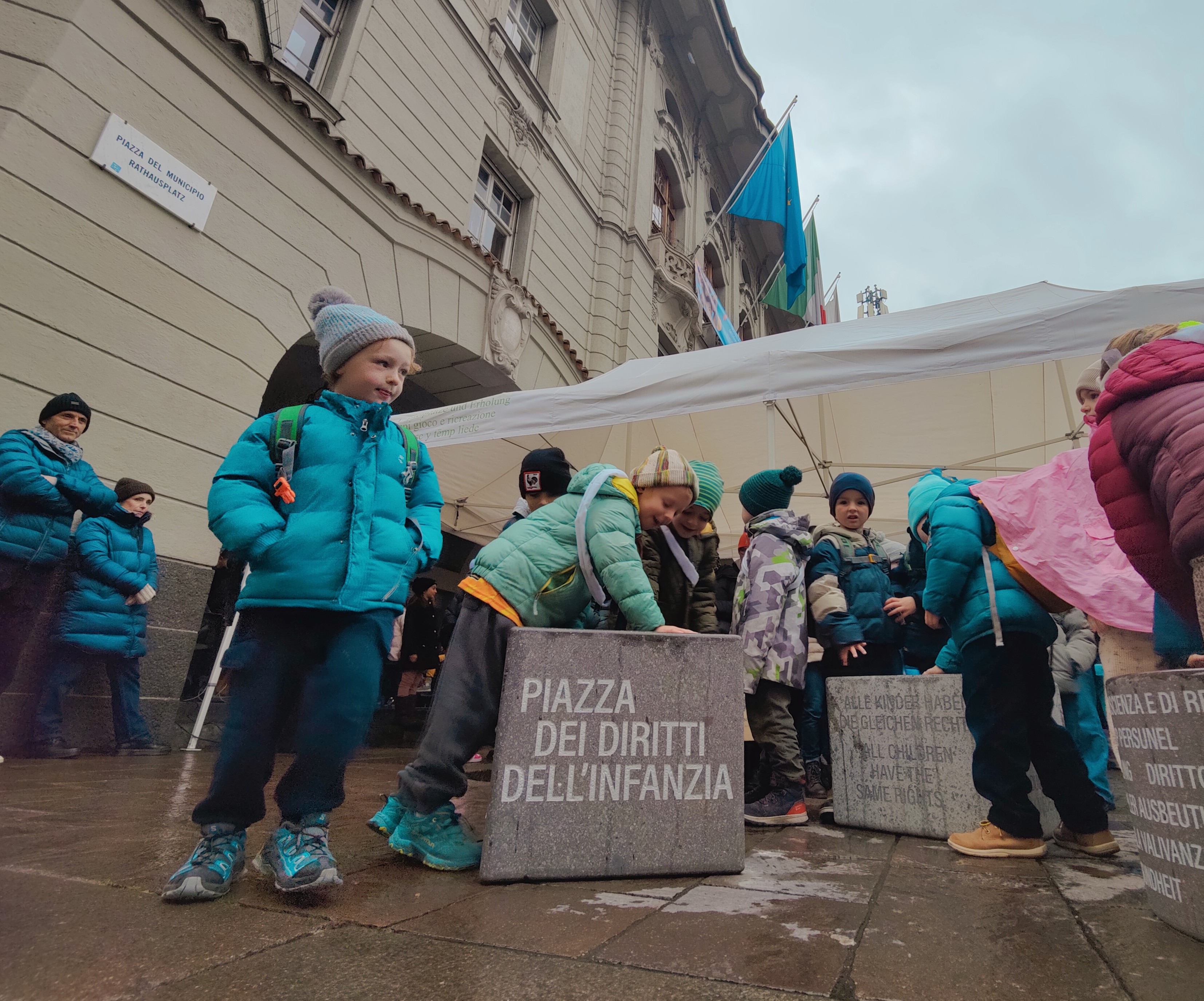 "Se leggiamo i dieci diritti dei bambini - ha detto il Sindaco di Bolzano Claudio Corrarati - c'è al quello di giocare. Gli adulti alle volte dicono che i bambini facciano tanto rumore. Ma se una città si lamenta del rumore dei bambini non è una città: quindi - continua Corrarati rivolgendosi ai bambini - fate rumore. Va costruita una città a misura di bambino, come si fa con l’istruzione e con le scuole“. Il Sindaco ha inoltre spiegato che l’installazione artistica inaugurata oggi e la denominazione simbolica della piazza ”oltre a essere un segnale, vogliono rappresentare uno stimolo alla riflessione e un monito per tutti affinché i diritti non restino solo sulla carta, ma diventino concreti in ogni scelta, gesto e azione quotidiana.