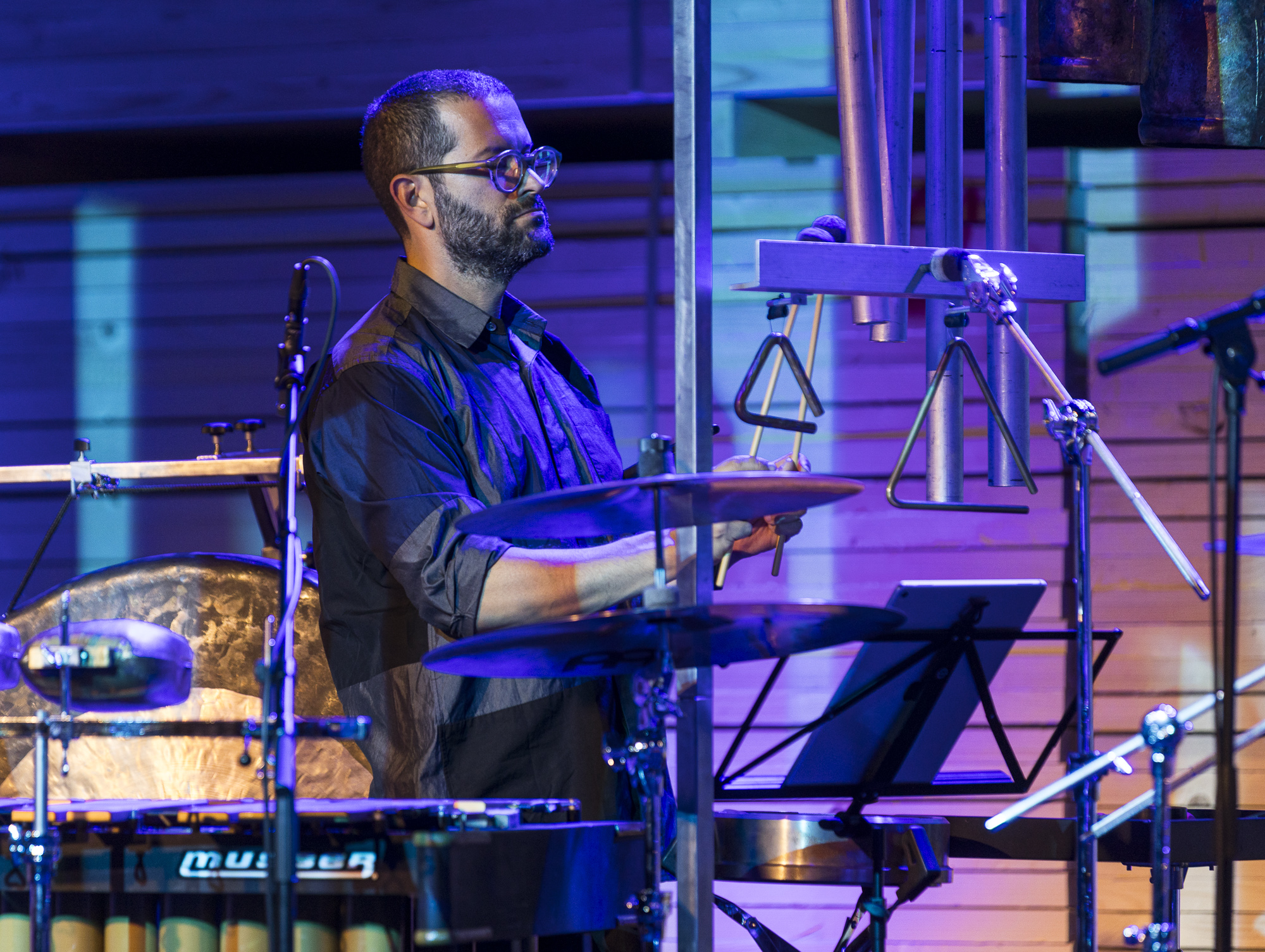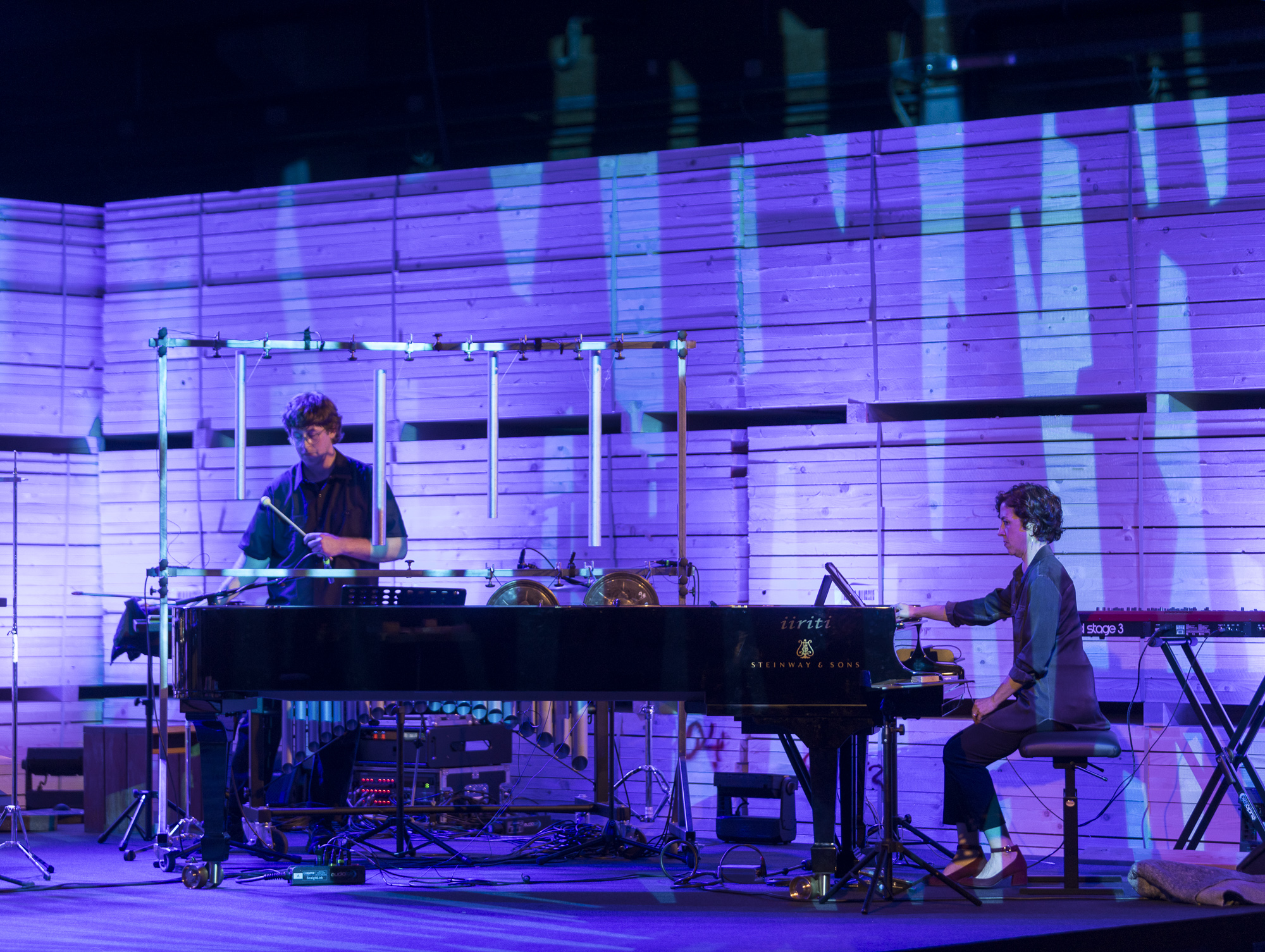Il programma annunciava Feedback Studies for percusssion di Sarah Davachi, Little Jimmy di Andrew McIntosh e Tactile Values di Antonhy Cheung. Opere rispettivamente del 2022, del 2020 e del 2023, tutte commissioni di Yarn/ Wire, in prima esecuzione italiana. Il palco era gremito di strumenti, due pianoforti, due tastiere elettroniche, computer, due set di gong, campane tubolari, rullante, piatti e cassa, e altre piccole percussioni.