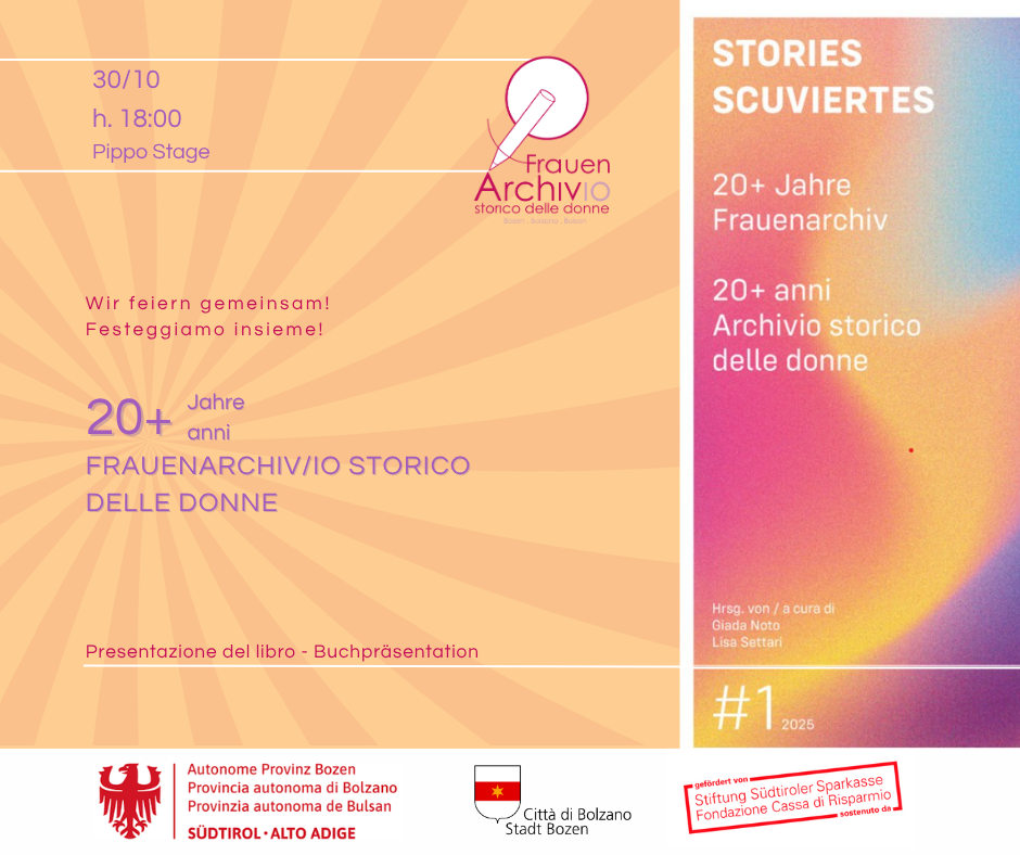 Die Feier 20 Jahre Frauenarchiv Bozen findet diesen Donnerstag, 30. Oktober um 18 Uhr im Pippo Stage in Bozen statt.